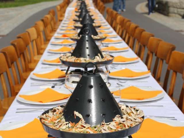 Gemeinsam geniessen wir gegrilltes Fleisch und Grillkäse vom Tatarenhut auf der Guttanner Dorfstrasse. Dazu gibt es Gemüse, verschiedene Marinaden und Saucen sowie Pommes Frites und Reis.