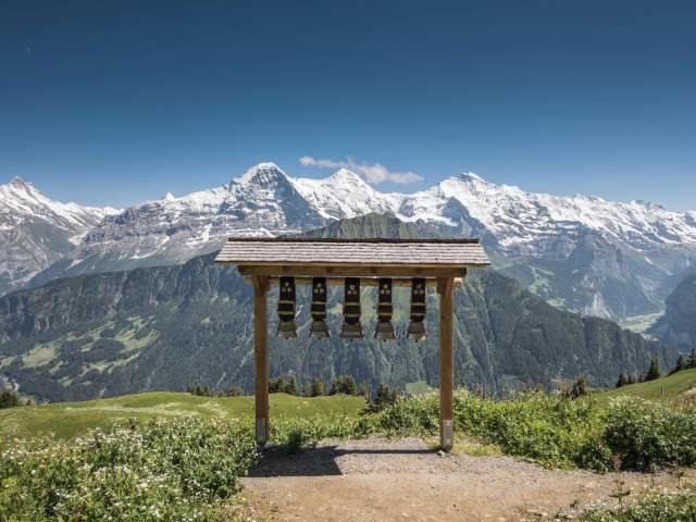 Die im Juni 2025 eröffnete Aussichtsplattform bietet ein atemberaubendes Panorama auf die Berner Alpen. Beim kurzen Spaziergang schweift der Blick über blühende Alpwiesen und eindrucksvolle Gipfel – bis hinunter zum Thunersee, der tief im Tal liegt.