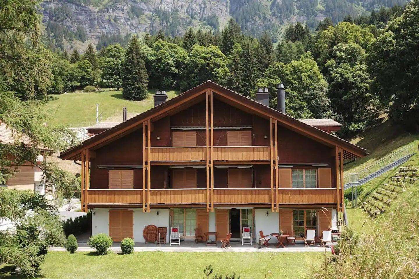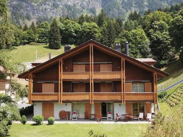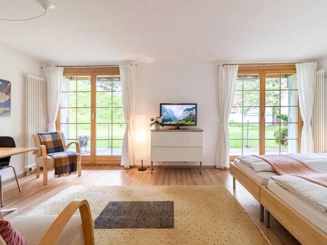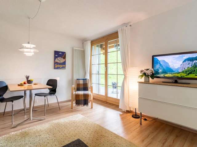 Ground floor apartment in a very quiet ski-in / ski-out area and an 8-minute walk from the Wengen train station and village center. Spacious studio with an open floor plan and a large garden terrace with stunning mountain views.