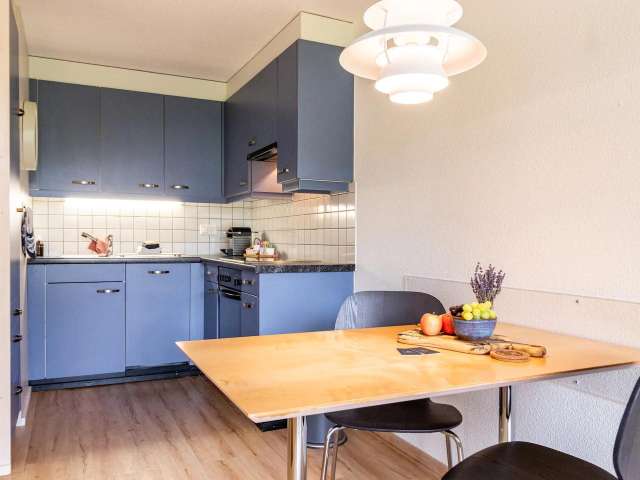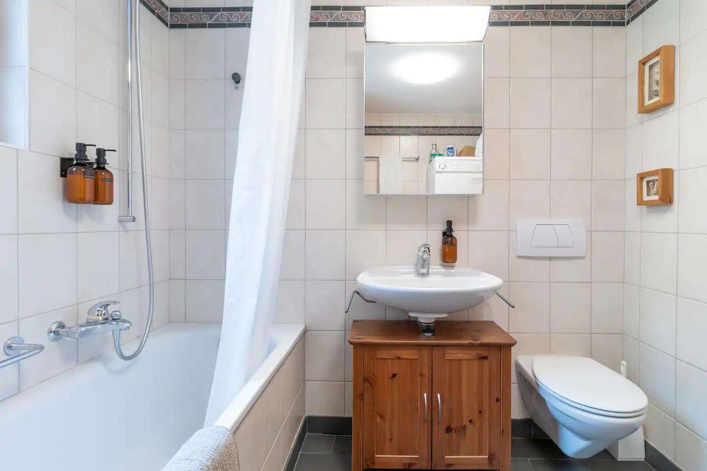Comfortably situated on the ground floor, for easy access in and out of the exterior garden space. The full-sized kitchen is open to the dining and living area with a four-burner cooktop/stove, oven, refrigerator, freezer, and dishwasher. Fully equipped with the essentials, including dishes & silverware, pots & pans, a coffee machine & coffee, tea kettle & tea. The studio is suitable for 2 people and in the perfect location for winter and summer activities. Ski-in, ski-out & sled-in, sled-out in the winter or hike-in, hike-out & bike-in, bike-out in the summer with the most beautiful “Wanderwege” (hiking trails) Switzerland has to offer.