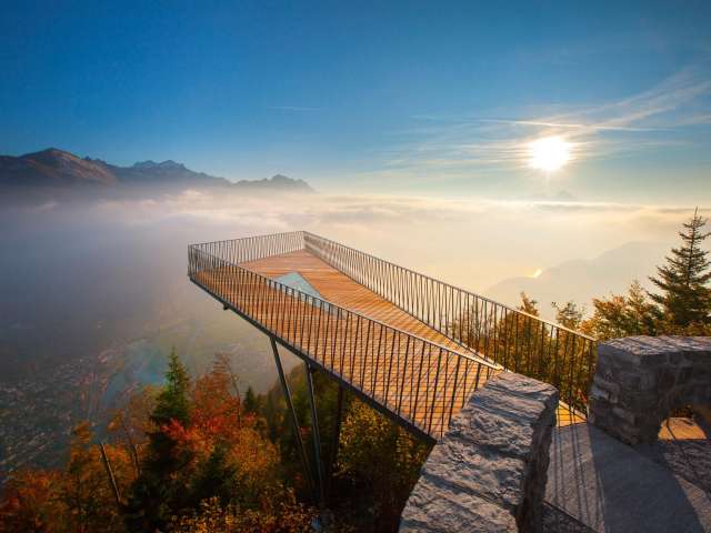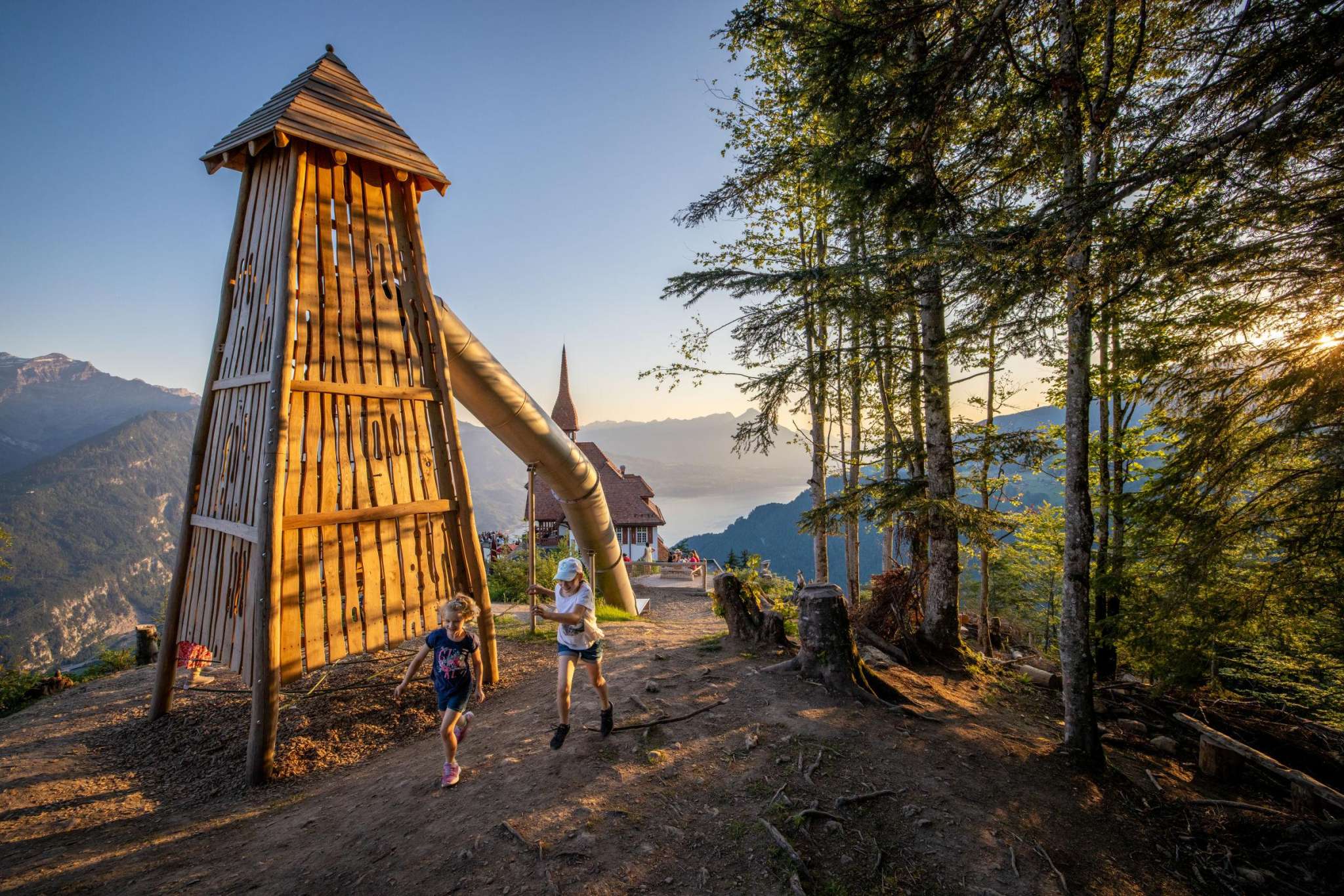 At the top, a breathtaking panorama unfolds: far below lies the «Bödeli» between Lake Thun and Lake Brienz, while on the horizon, the majestic trio of the Eiger, Mönch and Jungfrau captivates the view.