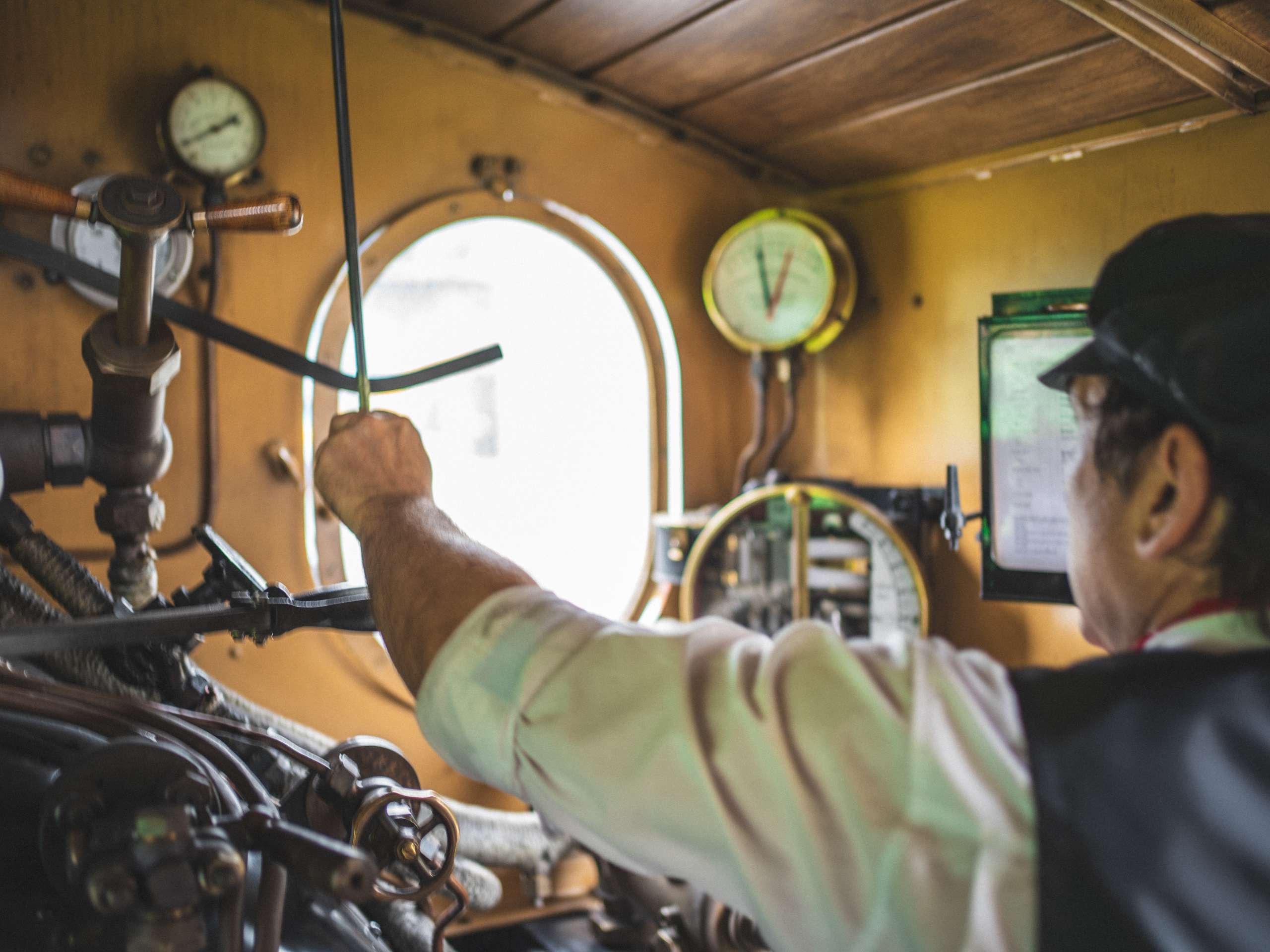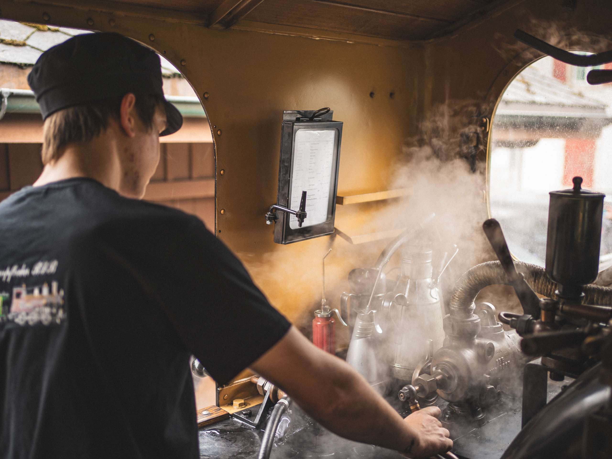 Sunday morning, 7.30 am. The Brünig Dampfbahn depot at Interlaken Ost station is bustling with activity. Andreas "Andy" Alig, locomotive driver and workshop employee, greets us. He is working on the type G 3/4 locomotive (number 208). "We'd better do without shaking hands," he says - and laughs. His hands are full of oil. Minutes later he fills boiler after boiler with coal, which is then emptied into the driver's cab of the locomotive. And a brake test is also carried out. He has been on site since 5 o'clock in the morning. A journey with the steam train needs its lead time. The locomotive was even heated up the evening before.