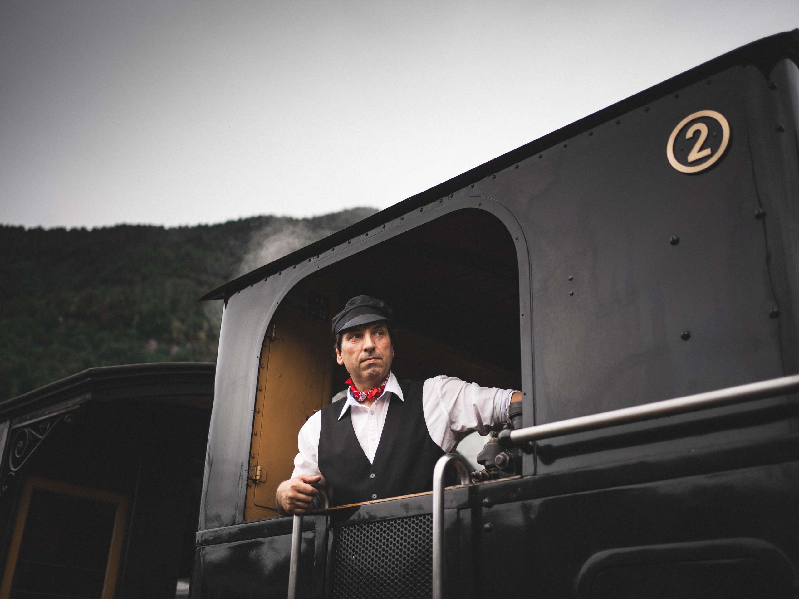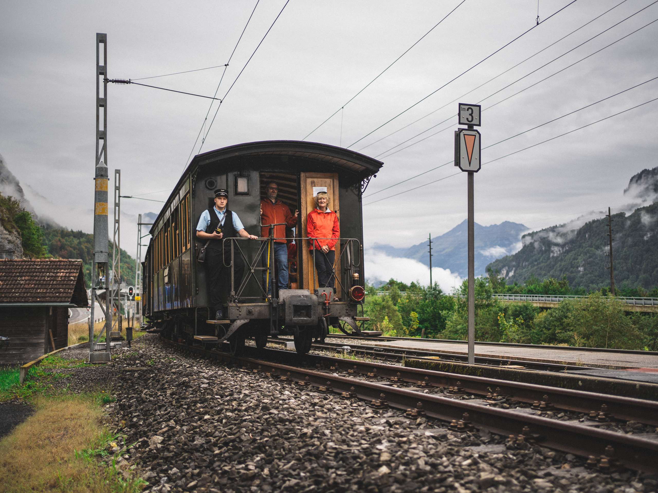 9.15 a.m.: Hardly on the way, Rosmarie Grossen and her granddaughter Amalia Grossen arrive with baskets full of drinks and sandwiches from carriage to carriage. We treat ourselves to a fine coffee. And we get to know Mike Ellis, Head of International Marketing and workshop employee. The Englishman is now working as a trolley attendant. "There has to be one attendant per wagon, that's the rule, for safety reasons," he explains to us. We sit in the rearmost wagon, through a door we get out into the open, we have a direct view of the tracks at the back - and of the turquoise-blue Lake Brienzersee. Speaking of blue, we look in vain for this colour in the sky. Instead of over 30 degrees as during the week, the thermometer shows only 15 to 20 degrees today. The sky is grey and wafts of fog pass us by. In the evening, looking at the photos, we realise: Maybe just the perfect weather for high-contrast shots.