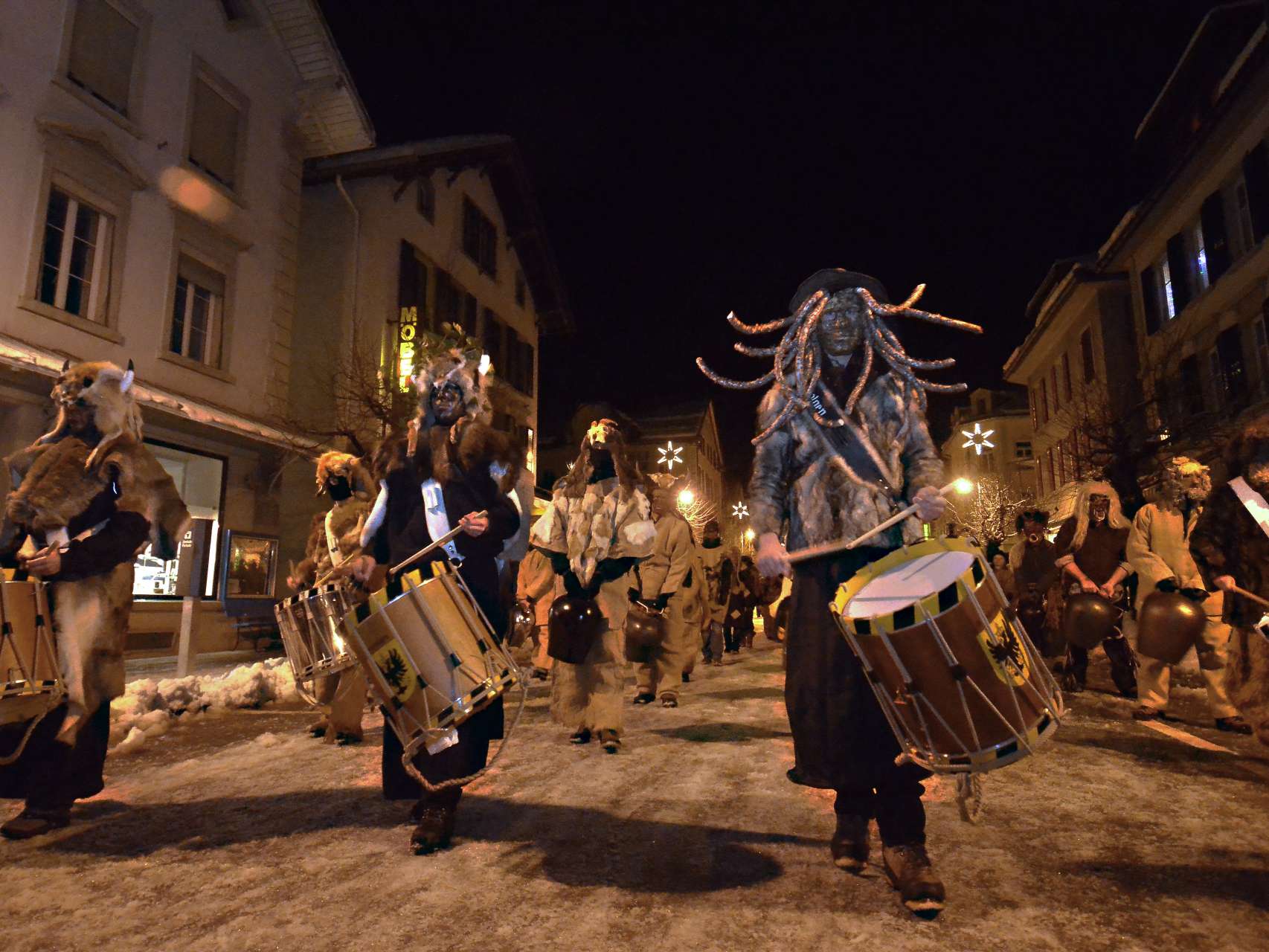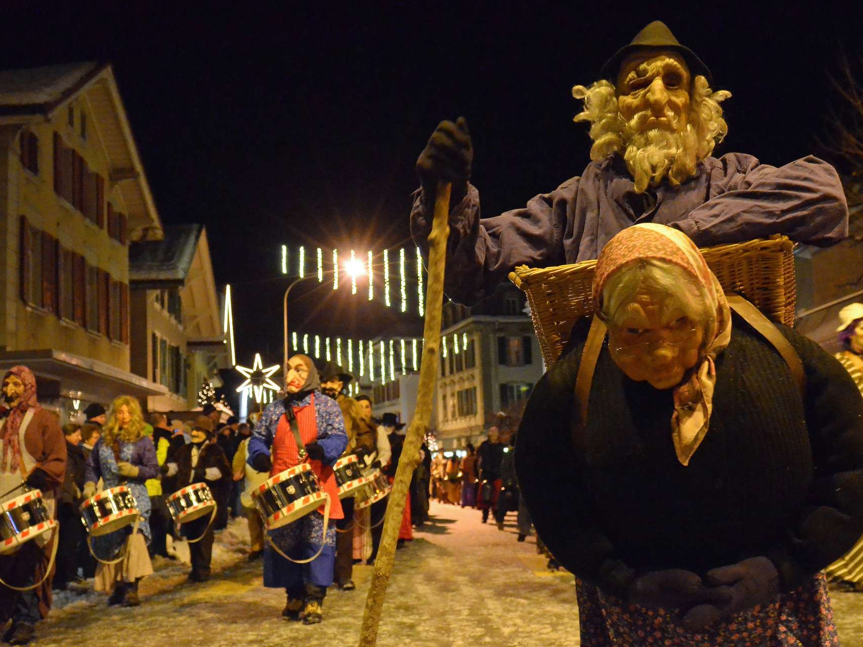 La semaine de l'Ancienne Année au Haslital est une coutume très ancienne d'origine celtique. Celle-ci remonte à l'époque pré-chrétienne, lorsque les habitants des vallées de montagne utilisaient des trykels pour éloigner les mauvais esprits de leurs villages pendant les nuits les plus longues de l'année. Aujourd'hui encore, cette coutume est maintenue et transmise à la génération suivante. Chaque jour, les cortèges de trychels deviennent plus puissants, le bruit plus fort jusqu'au point culminant de la nuit du "Ubersitz". Ce soir-là, tous les trychlers des localités environnantes Willigen, Hausen, Eisenbolgen, Unterbach, Hasliberg et Meiringen se rendent au centre du village de Meiringen pour un défilé commun de trychels. La semaine de la vieille année commence toujours dans la nuit du 25 au 26 décembre et s'étend jusqu'au dernier jour ouvrable de l'année, le "Ubersitz". Pendant cette tradition annuelle, les restaurants et les bars gardent leurs portes ouvertes pour toi. Tu veux te réchauffer avec un vin chaud ou calmer ta faim avec un délicieux Chäsbrätel ? Alors tu es au bon endroit à Meiringen. Les stands de nourriture et de boissons ne manquent pas non plus. L'ambiance unique, l'atmosphère inoubliable et la vue impressionnante captivent petits et grands.