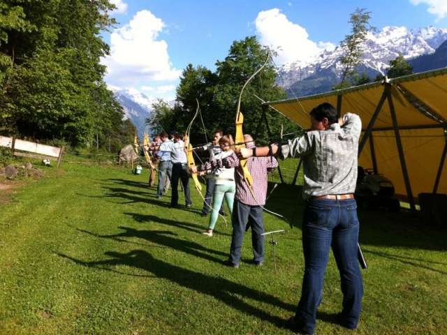La concentration, la perception du corps et l'intuition sont les conditions préalables pour tirer dans le mille avec un arc et des flèches. Vous apprenez à tirer intuitivement, c'est-à-dire sans dispositif de visée. Même avec la sarbacane, votre intuition pour la trajectoire de la flèche est plus importante que la visée classique, qui intervient lors de l'utilisation de l'arbalète. Dans le cadre de ces Olympiades, vous effectuez les disciplines du tir à l'arc, de la sarbacane et de l'arbalète.