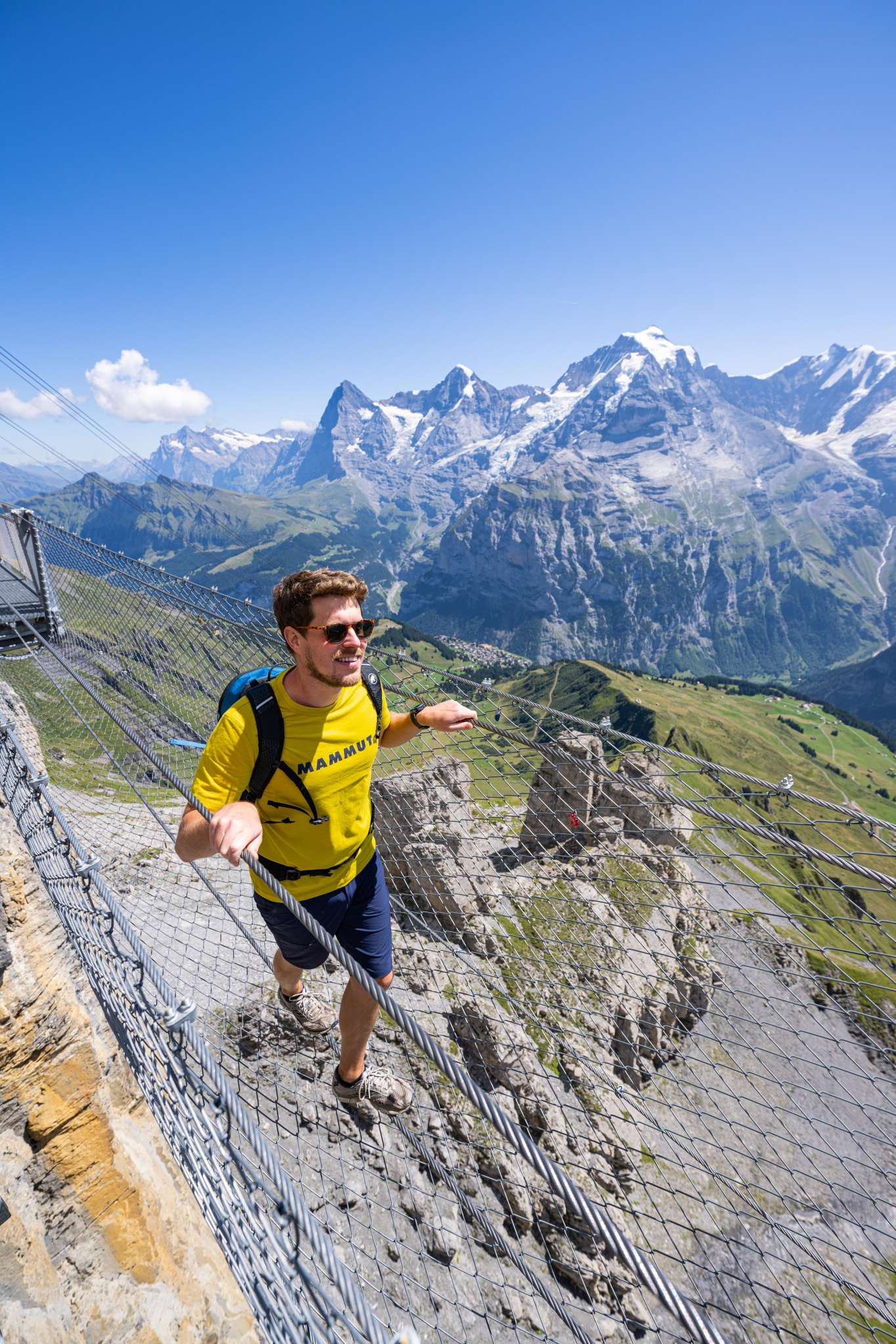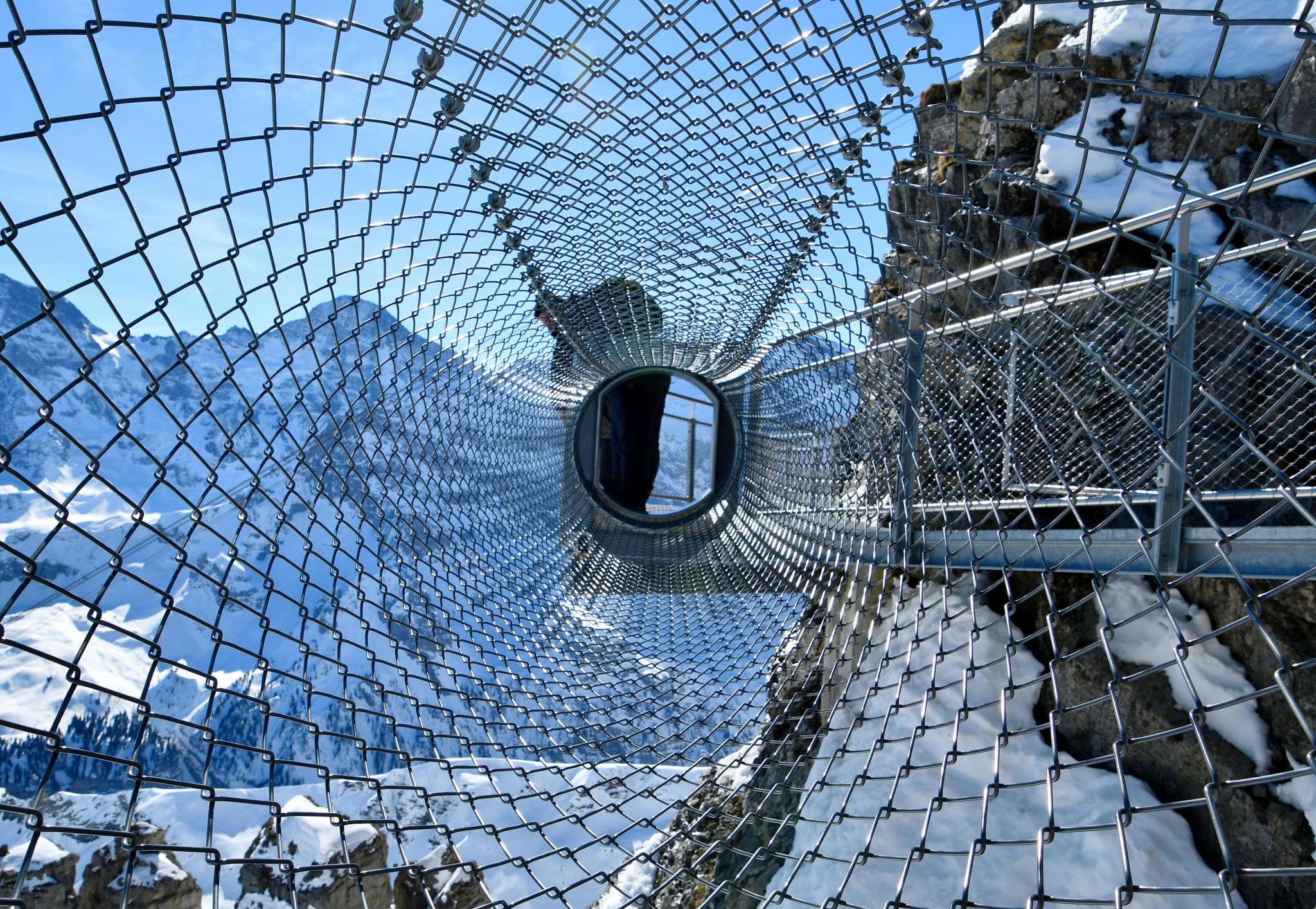 Si tu te diriges vers le Schilthorn depuis Mürren, tu arriveras à la station intermédiaire de Birg après le premier trajet en télécabine. Ici, tu devrais prévoir un arrêt plus long pour visiter le Thrill Walk. Il garantit à tous ceux qui osent le franchir un pouls plus élevé. La passerelle rocheuse d'environ 200 mètres de long a été construite dans la roche le long du gouffre vertical. La construction en acier et en verre ainsi qu'un sol en caillebotis, s'intègre parfaitement dans le paysage rocheux anguleux. Tu devrais consacrer environ 45 minutes à la visite du Thrill Walk, afin d'avoir suffisamment de temps pour prendre quelques photos spectaculaires. En plus du caillebotis dont la passerelle et les escaliers sont en grande partie constitués, il y a environ 20 mètres de sol en verre, des éléments de sol en caillebotis pour bétail et un pont de corde de neuf mètres de long avec filet de sécurité. Un tunnel rampant de huit mètres complète l'expérience. L'entrée du Thrill Walk se trouve du côté de la terrasse panoramique de la station Birg. Après les 200 mètres de sensations fortes, tu atteindras l'extrémité de la passerelle située plus bas. De là, un chemin de gravier (recouvert de neige en hiver) monte jusqu'au bâtiment de la station.